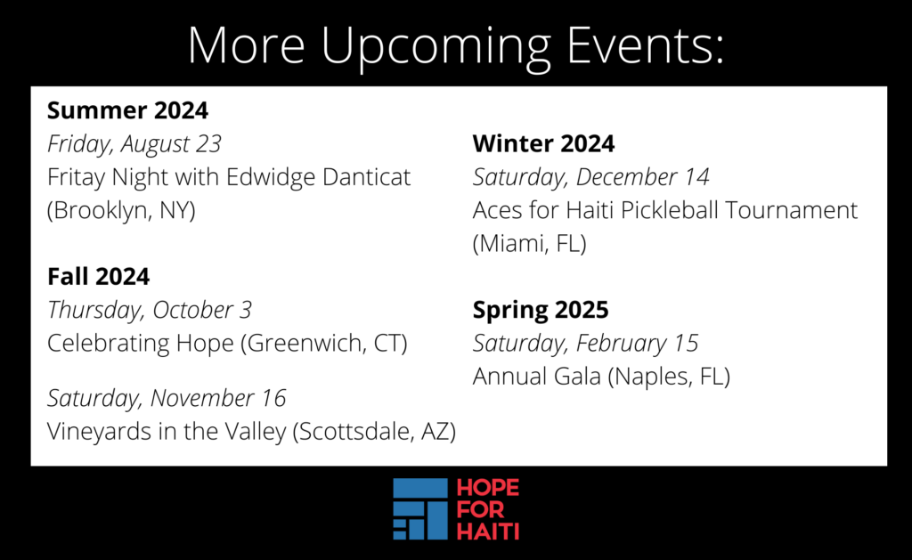 Join us at one of our events to support our programs and learn more about our work in rural southern Haiti! You can learn more about these events, including how to purchase tickets, on our Upcoming Events page here. More details coming soon!