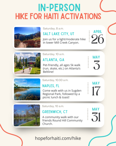 Since the first Hike for Haiti in 2019, people from around the world have come together to raise more than $800,000 through this feel-good movement. This year, our goal is to reach the $1 million mark, and we need your help!